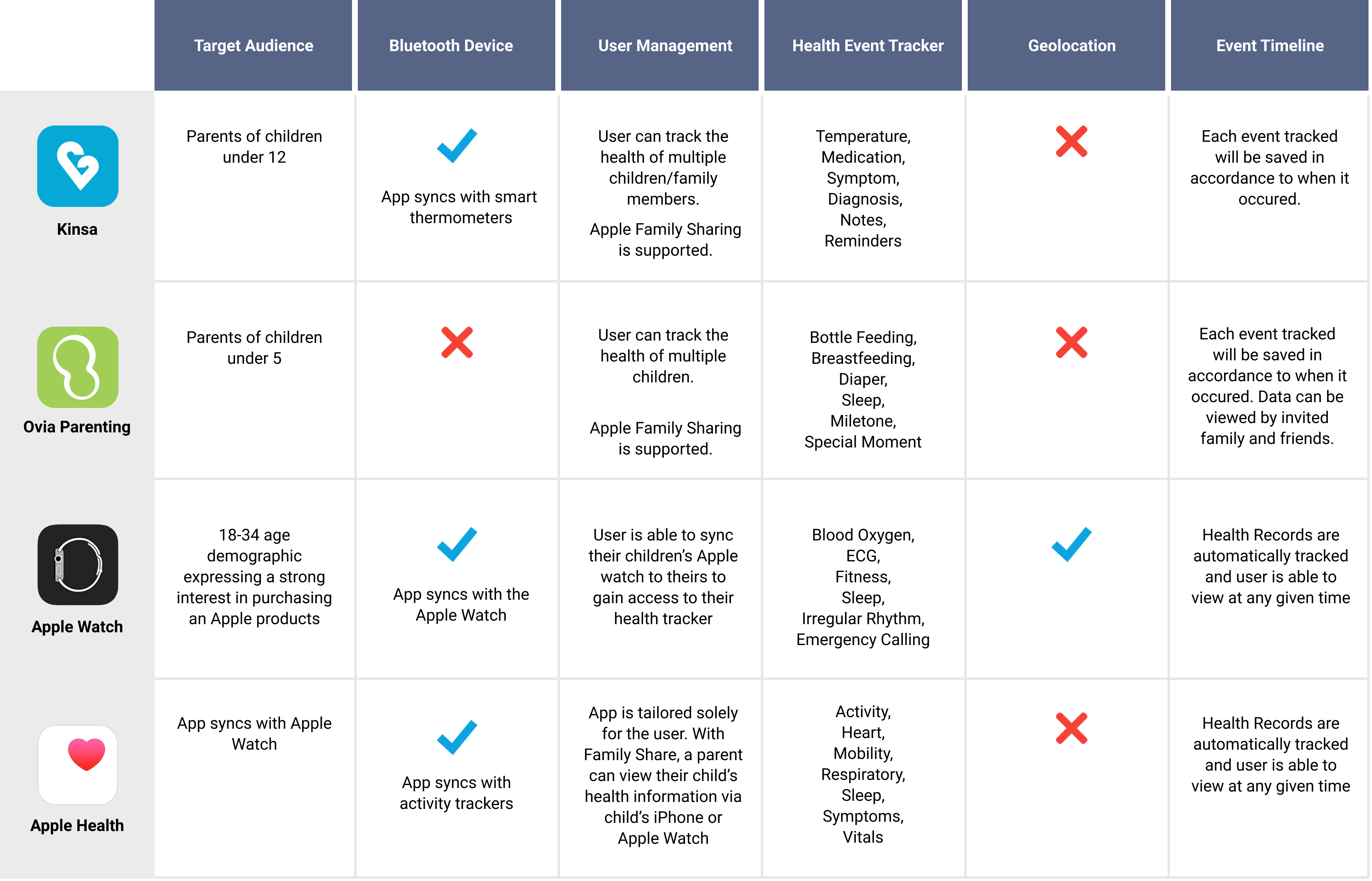 The initial steps we took as a team was performing a competitor analysis with similar tools and softwares that were on the market, the biggest being Fitbit. Upon completion of the competitor analysis, we gained insights into a handful of key features that might be promising to include into Kidsband.