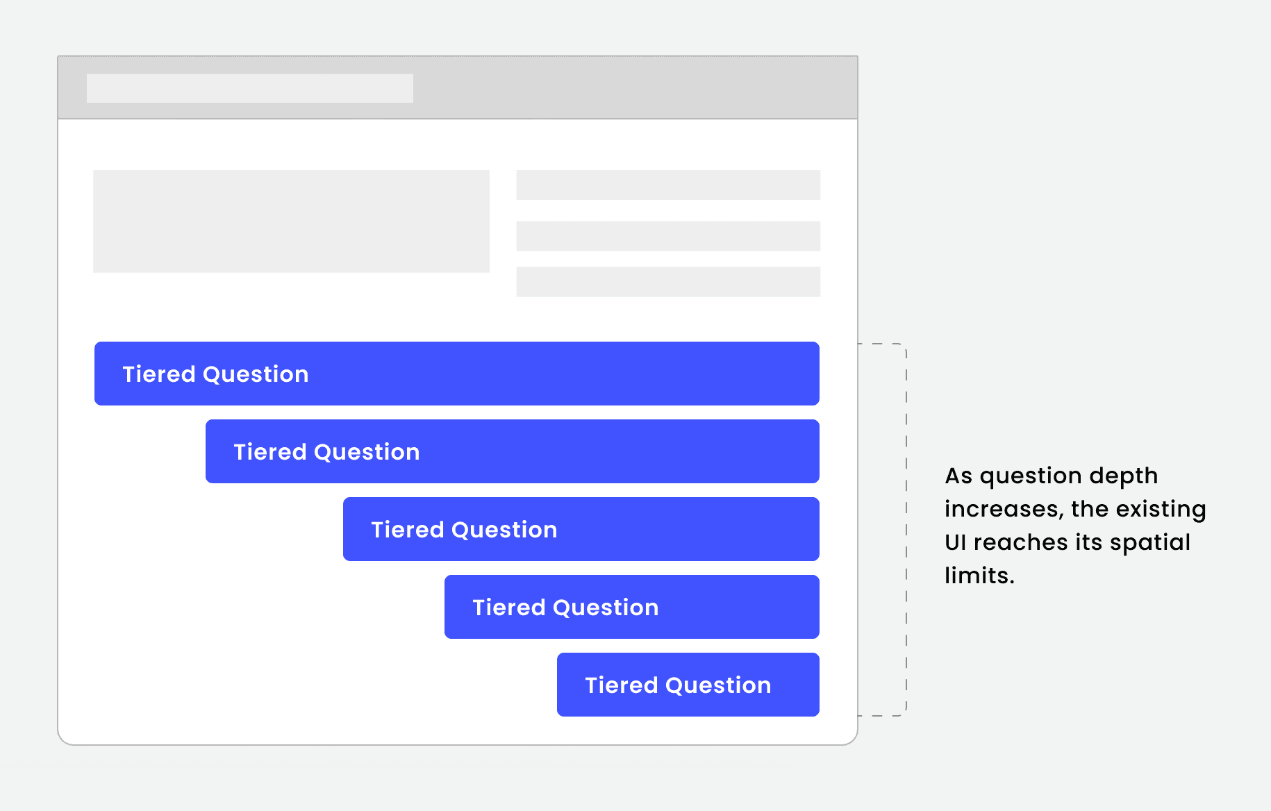 The existing questionnaire framework was not designed to support tiered questions. Adding this functionality would overcrowd the interface and result in a confusing, unusable experience.