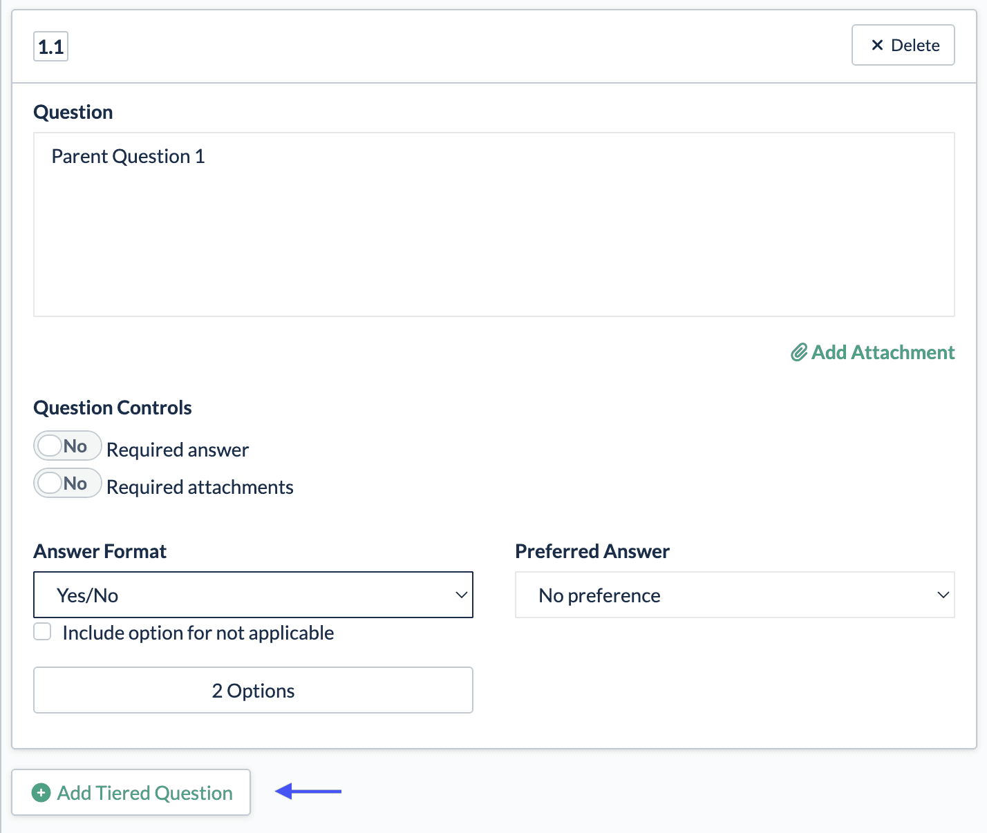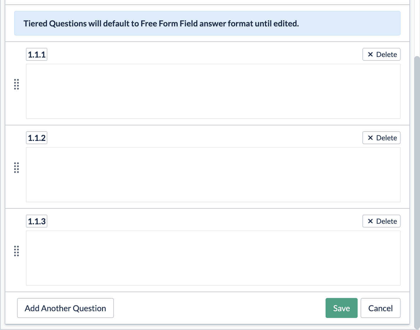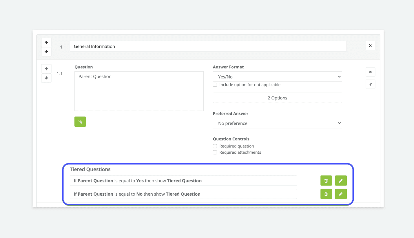 Tiered questions start with three default entries to give teams a quick, consistent starting point. These can be edited or removed at any time, keeping things fast without limiting flexibility.